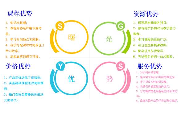 據(jù)曙光在線(xiàn)教育資格證項(xiàng)目總監(jiān)姜仲祥介紹,曙光在線(xiàn)教育教師資格證在線(xiàn)課程擁有的四大優(yōu)勢(shì)(課程優(yōu)勢(shì)、資源優(yōu)勢(shì)、價(jià)格優(yōu)勢(shì)、服務(wù)優(yōu)勢(shì))能為學(xué)員輕松順利通過(guò)教師資格證考試保駕護(hù)航!